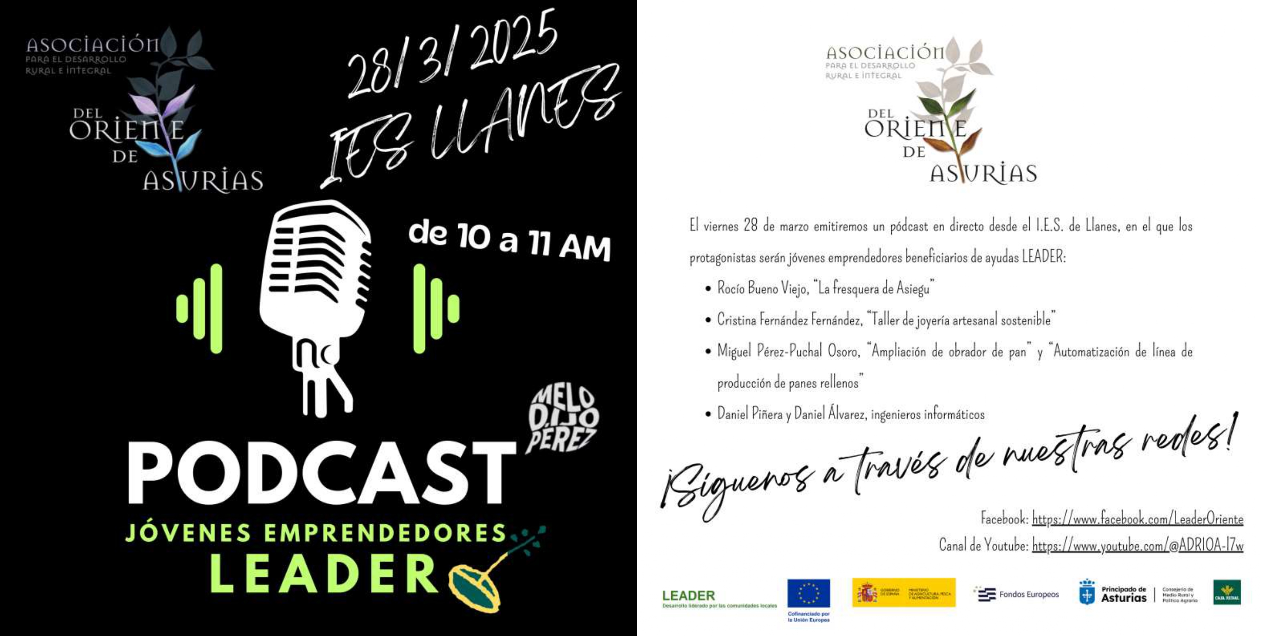 La Asociación para el Desarrollo Rural Integral del Oriente de Asturias ha organizado para mañana viernes 28 de marzo la emisión del podcast Emprendedores Leader en directo desde el IES de Llanes. El objetivo de este programa, realizado y dinamizado por Melodijopérez, es dar a conocer a jóvenes emprendedores beneficiarios de ayudas Leader.