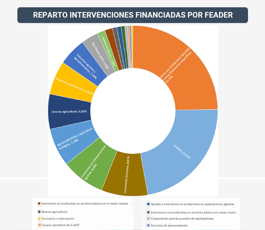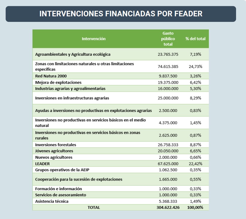 Asturias se erige en la comunidad autónoma con una mayor apuesta por los fondos Leader, con un presupuesto de 67.625.000 millones de euros, lo que supone el 22,42% de las intervenciones financiadas por el Fondo Europeo Agrícola de Desarrollo Rural (FEADER), que gestionan las comunidades autónomas. Tan solo supera esta partida la destinada a la intervención en zonas con limitaciones naturales u otras limitaciones específicas, con 74.615.385 millones de euros (24,73%). El monto total del presupuesto asciende a 30.4622.426 millones de euros.