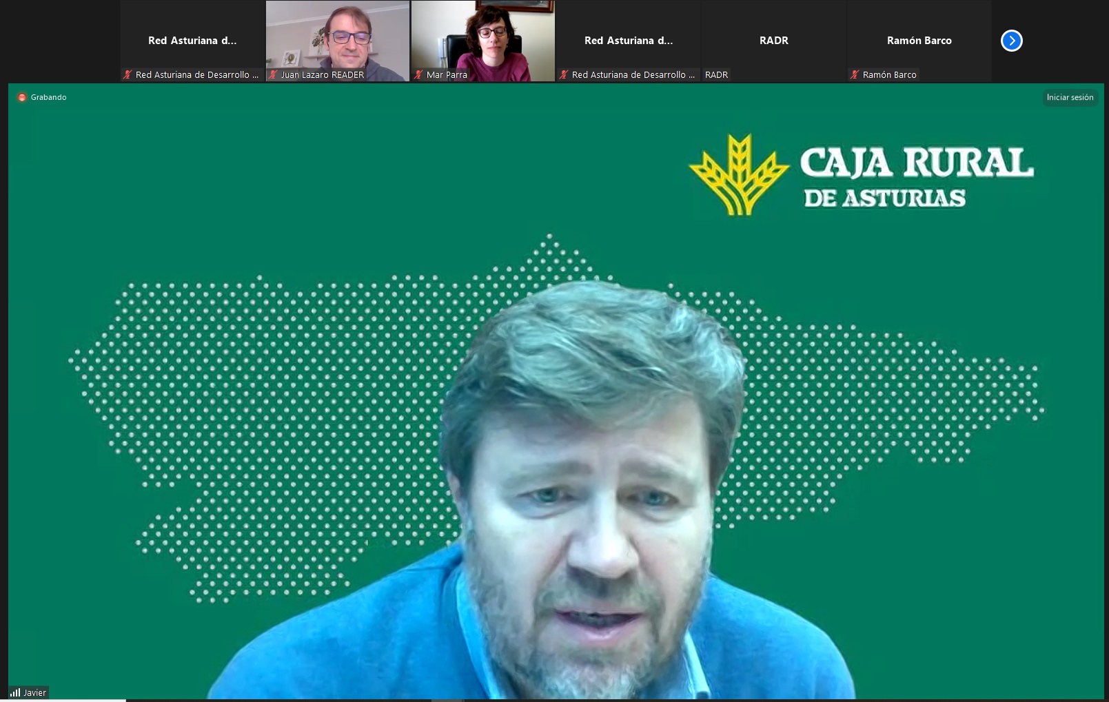 Tras la bienvenida a cargo del gerente de READER, Juan Antonio Lázaro Menéndez, y del responsable de Medio Rural de Caja Rural de Asturias, Javier Nievas Andrés, arrancó el segundo webinar organizado por la Red Asturiana para conocer la situación del programa LEADER en otros territorios.