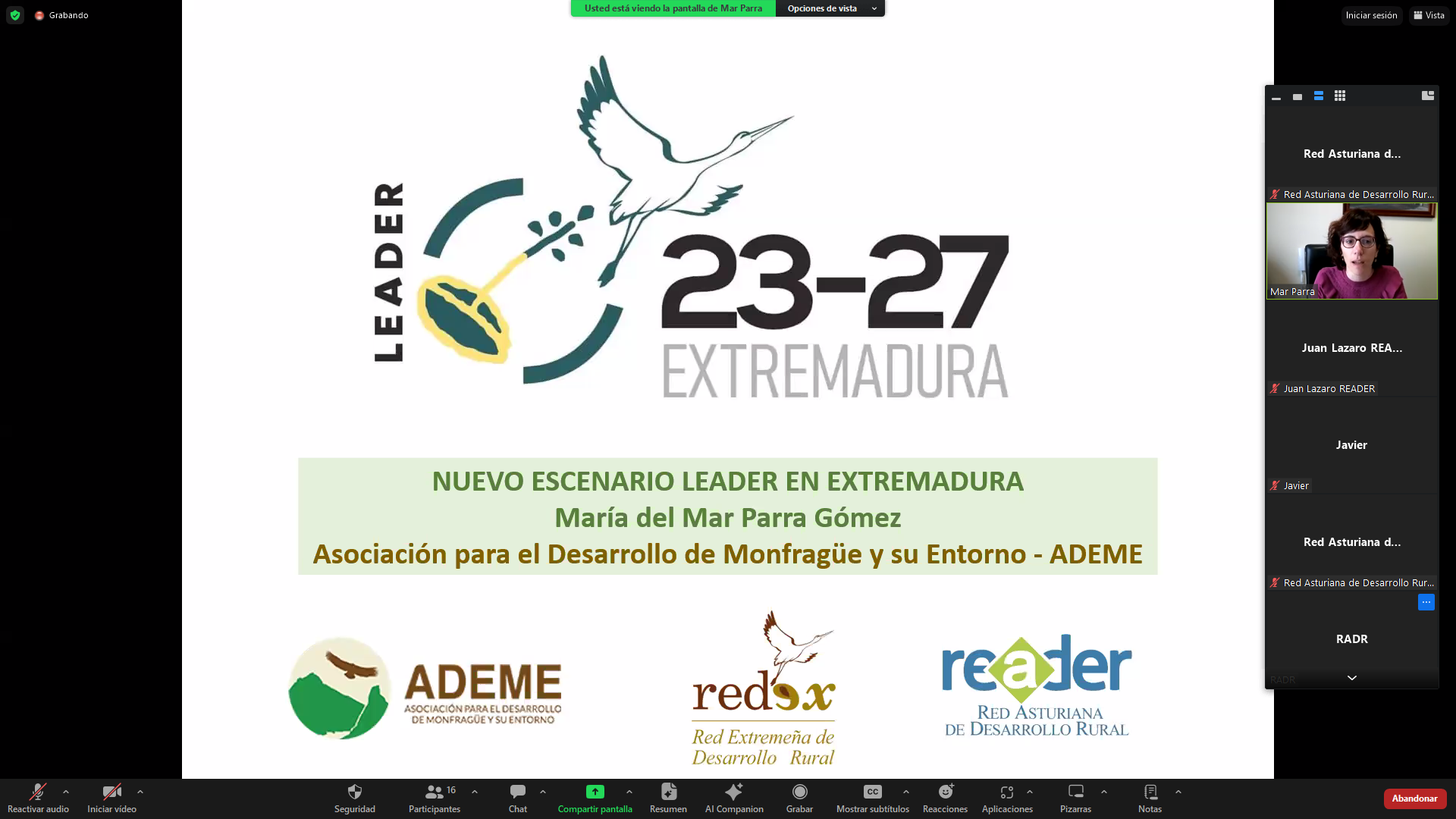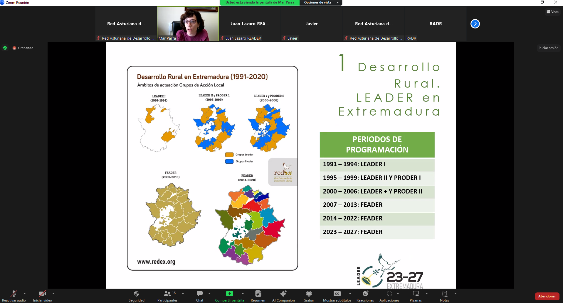 La Red Extremeña de Desarrollo Rural (REDEX) fue nuestra segunda invitada a participar en los webinares de los lunes dedicados al LEADER en otros territorios. La gerente de la Asociación para el Desarrollo de Monfragüe y su Entorno (ADEME), María del Mar Parra Gómez, presentó el momento actual de este programa europeo, a caballo entre los dos periodos, bajo el título 'Nuevo escenario LEADER en Extremadura'.