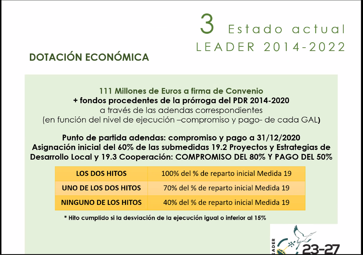 Actualmente la dotación económica con la que cuenta el LEADER 2014-2022 es 111 millones de euros, más otros fondos procedentes de la prórroga a través de las adendas correspondientes, que se distribuye en función del nivel de ejecución (compromiso y pago) de cada Grupo de Acción Local (GAL), como explica en la siguiente diapositiva: