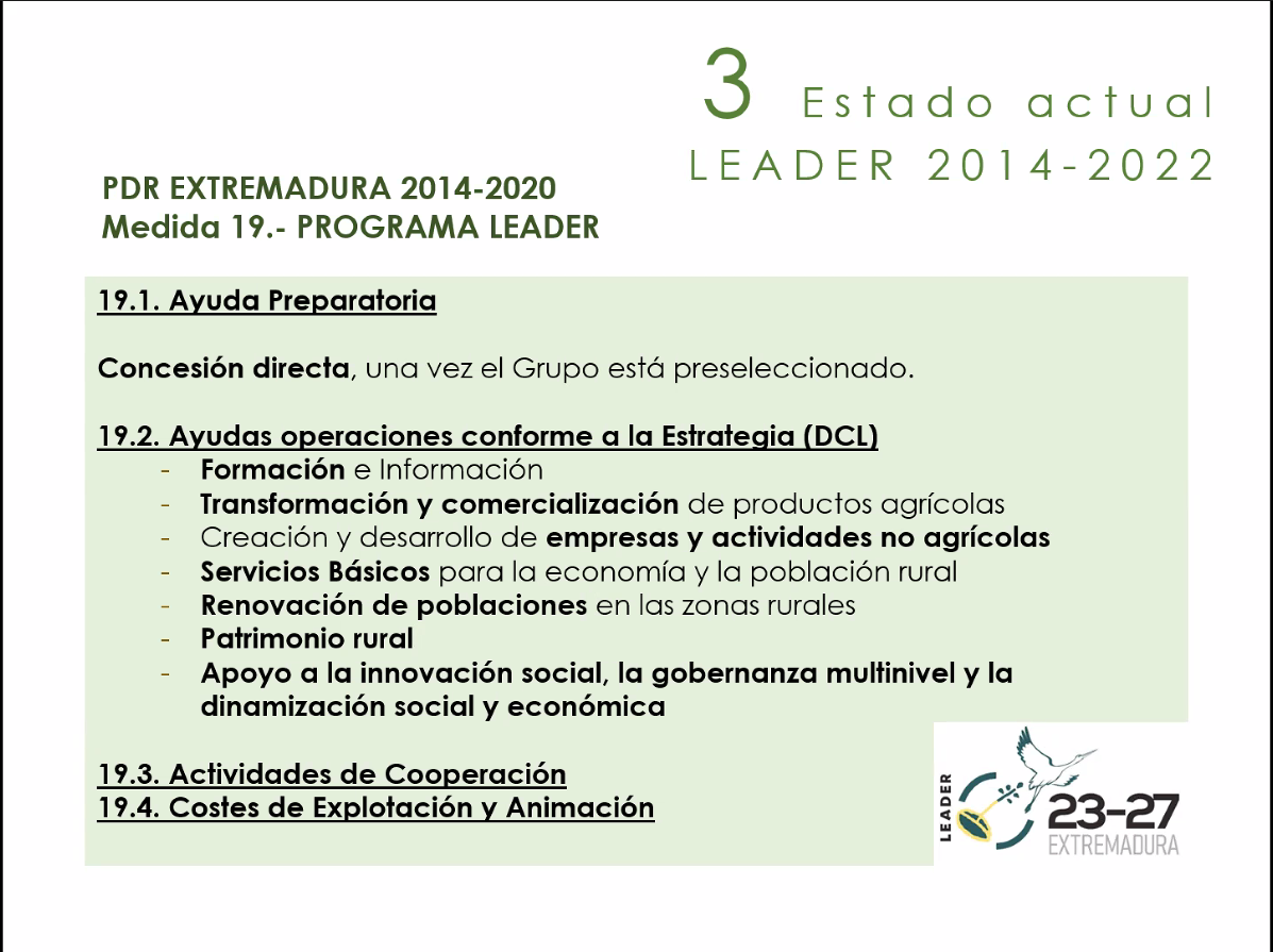 En diciembre de 2022 tuvo lugar la selección de Estrategias, cuya resolución fue publicada en mayo de 2023 en el Diario Oficial de Extremadura. En diciembre del año pasado tuvo lugar la firma del convenio entre la Consejería de Agricultura, Ganadería y Desarrollo Sostenible y los GAL, mientras que actualmente se encuentran trabajando en el borrador, en su versión tercera, de la Orden LEADER 2023-2027.