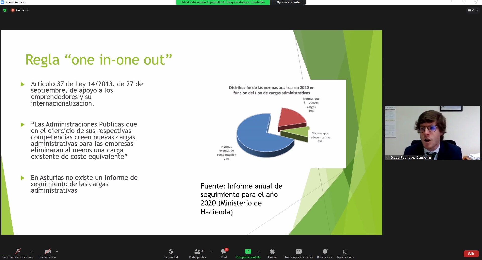 Rodríguez Cembellín también se detuvo en su exposición en la regla one-in-one-out, o de compensación de cargas, donde por cada carga nueva que se cree, la Administración debería retirar una similar, según recoge la ley 14/2013, de 27 de septiembre, de apoyo a los emprendedores y de internacionalización, al tiempo que señaló que en Asturias no existe un informe de seguimiento de las cargas administrativas.