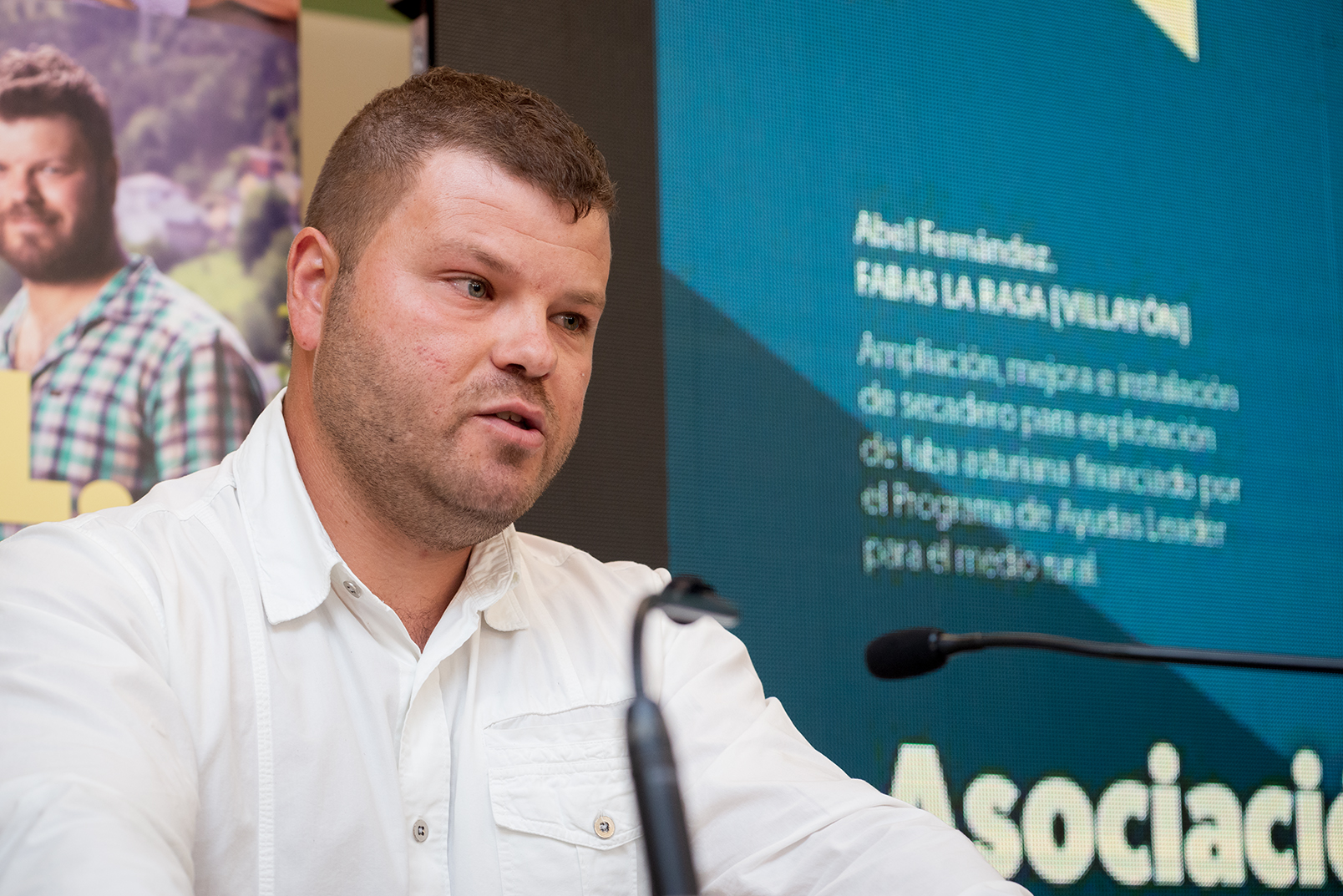 Abel Fernández García abrió su intervención mostrando su gratitud al LEADER y se remontó 30 años para señalar de dónde nace su proyecto: de un complemento a la economía de los padres. Tras perder en 2012 un trabajo por cuenta ajena, dio el paso al frente de la empresa familiar, Fabas La Rasa (Villayón), quintuplicando la producción, pasando de una hectárea y media a ocho de explotación. “Nada sería posible sin las ayudas LEADER, al menos de forma tan rápida”. Aunque reconoció que los márgenes hoy son muy justos, mientras que parte de los gastos los cubre con las ayudas. Denunció “la carestía importantes de suelo, lo que conlleva a aumentar los costes con alquileres”. También señaló dos problemas grandes: la importación de Bolivia (se producen entre 200 y 250 toneladas de faba IGP en Asturias, mientras que se importan unas mil toneladas), y el cambio climático, “con desbarajustes cada año peor”. “Falta de mano de obra porque no hay gente en los pueblos. Muy bien las ayudas LEADER, pero se necesitan más cosas” y rompió una lanza a favor de los cotos de caza como control de la fauna salvaje y conservación de bosques.