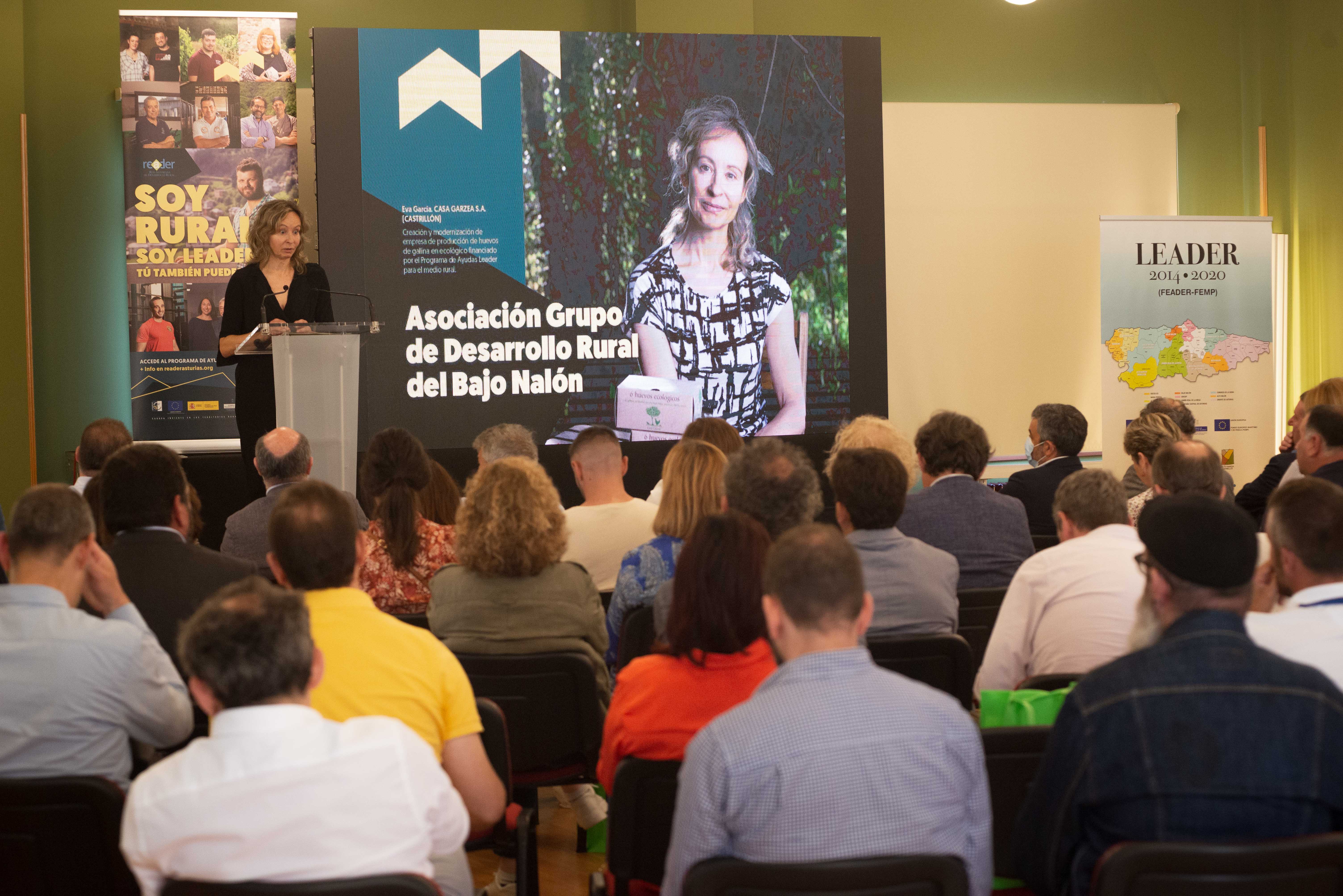 A continuación intervino la directora general de Desarrollo Rural, Begoña López Fernández, que calificó como “día de agradecimientos y de poner en valor el LEADER”, en una jornada dirigida a posicionar más estas ayudas con ponentes que “arriesgan su capital y que nos ayudarán a mejorar de cara al nuevo período”, con la ampliación de  4,5 millones de euros que permiten que los grupos sigan trabajando en este intermedio hasta que arranque el nuevo. “La apuesta del gobierno del Principado es clarísima. Asturias ha sacado la mayor convocatoria de Europa en 2020, lo que nos ha servido para cooperar entre nosotros con una mesa de trabajo con presencia del equipo jurídico, equipo pagador, READER… Hemos conseguido poner el LEADER en el lugar que le merece”, con ese 25% del Programa de Desarrollo Rural (PDR) destinado a esta iniciativa. “Asturias es rural, es emprendedora, es LEADER”, apuntó para agradecer públicamente a “mi equipo el trabajo y el esfuerzo que no se ve”, así como al trabajo realizado en la anterior legislatura que ha procurado el éxito en la actual, “y no vamos a bajar las manos. Sin los técnicos y los emprendedores no tendríamos de qué hablar hoy aquí”.