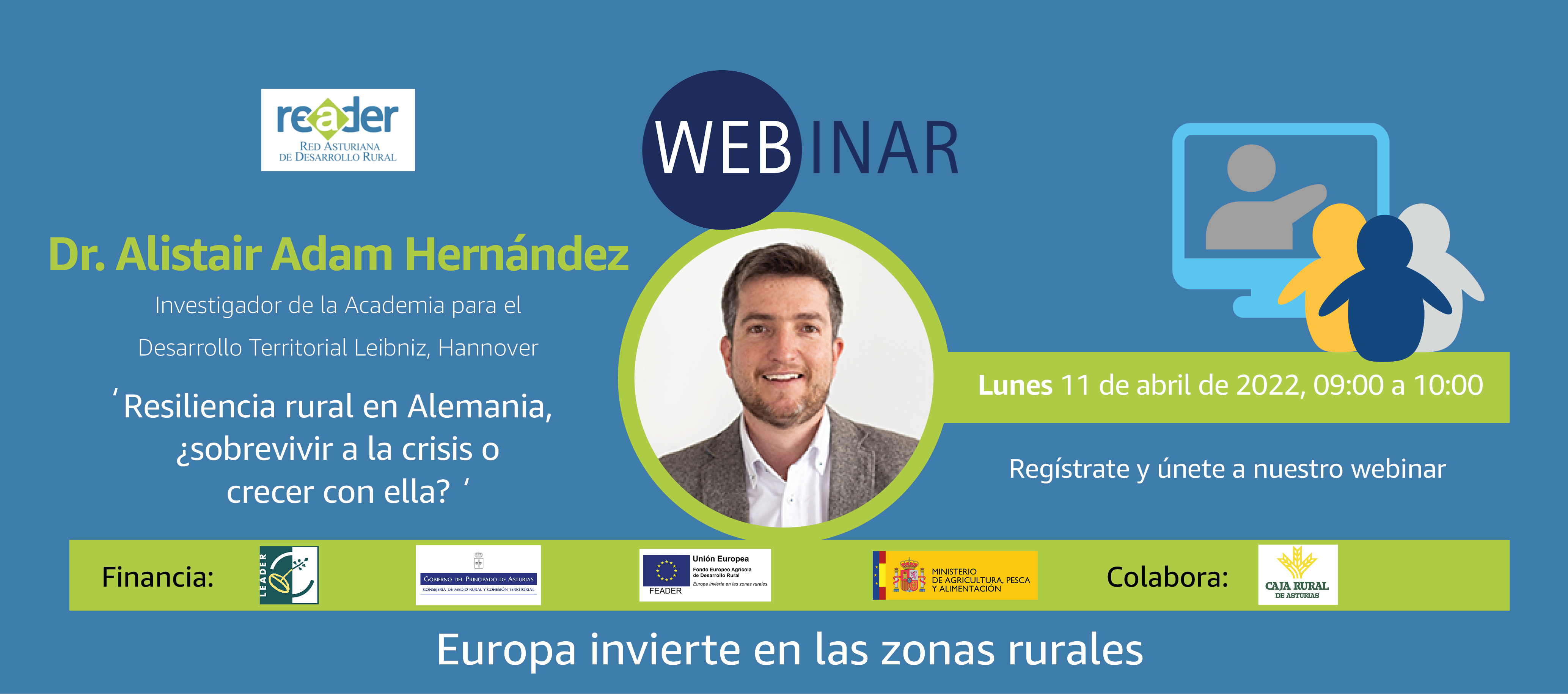 Los webinares organizados por la Red Asturiana de Desarrollo Rural (READER) para conocer un poco más sobre la gestión de las ayudas Leader en otros territorios vuelven el lunes 11 de abril. En esta ocasión viajaremos hasta Alemania de la mano del doctor Alistair Adam Hernández, investigador de la Academia para el Desarrollo Territorial Leibniz, Hannover (Alemania), que nos hablará sobre 'Resiliencia rural, ¿sobrevivir a la crisis o crecer con ella? Impulsando zonas y comunidades rurales más resilientes desde el Leader en la República Federal Alemana'.