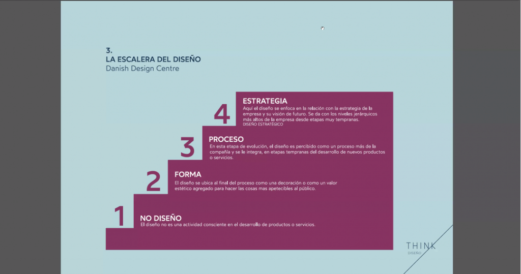 El diseñador se refirió a la denominada escalera del diseño, definida por el Centro Danés del Diseño que recorre cuatro escalones que van desde el No diseño a la Forma, el Proceso y la Estrategia, e hizo hincapié en la importancia de diseñar para el consumidor final y no para el cliente.