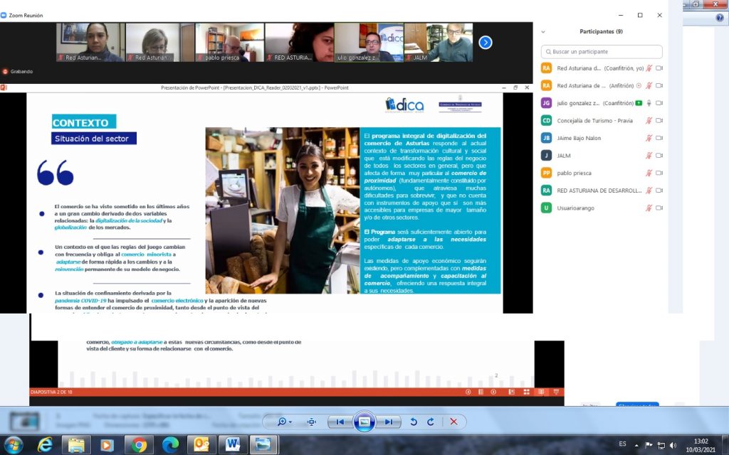 A diferencia de la comarca del Alto Nalón, donde la reunión fue presencial dado que no hubo más de cuatro asistentes tal como recomienda el protocolo COVID 19; en las comarcas de Bajo Nalón y Camín Real de la Mesa las reuniones se celebraron de forma telemática al superar la asistencia las cuatro personas permitidas en una misma sala. A la presentación en la comarca Camín Real de la Mesa, además del Director General de Comercio, Emprendedores y Economía Social, Julio González Zapico, el Director General del CTIC, Pablo Priesca, también asistieron el Presidente del GDR, Belarmino Fernández Fervienza, la Alcaldesa de Belmonte de Miranda, Rosa Rodríguez, el Alcalde de Quirós, Rodrigo Suárez, el Alcalde de Grado, José Luis Trabanco, la Alcaldesa de Candamo, Natalia González, la concejala del Ayuntamiento de Teverga, Celia González, el representante de la Asociación Siempre Grado, Manuel Ángel García, el representante de la Asociación Disfruta Teverga, Ángel Pérez y la Gerente del Grupo, Beatriz López.