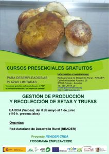 La Red Asturiana de Desarrollo Rural inicia el proyecto READER Crea, financiado por la Fundación Biodiversidad del Ministerio de Agricultura y Pesca, Alimentación y Medio Ambiente a través del programa Empleaverde, con un curso gratuito de Gestión y Producción de Setas y Trufas para desempleados que tendrá lugar en Barcia (Valdés). El proyecto incide directamente en la creación de empleo y en la cualificación profesional de los desempleados en el ámbito de la Red Natura 2000 y las Reservas de Biosfera de Asturias y la limítrofe de León (Reserva de la Biosfera de Alto de Bernesga).