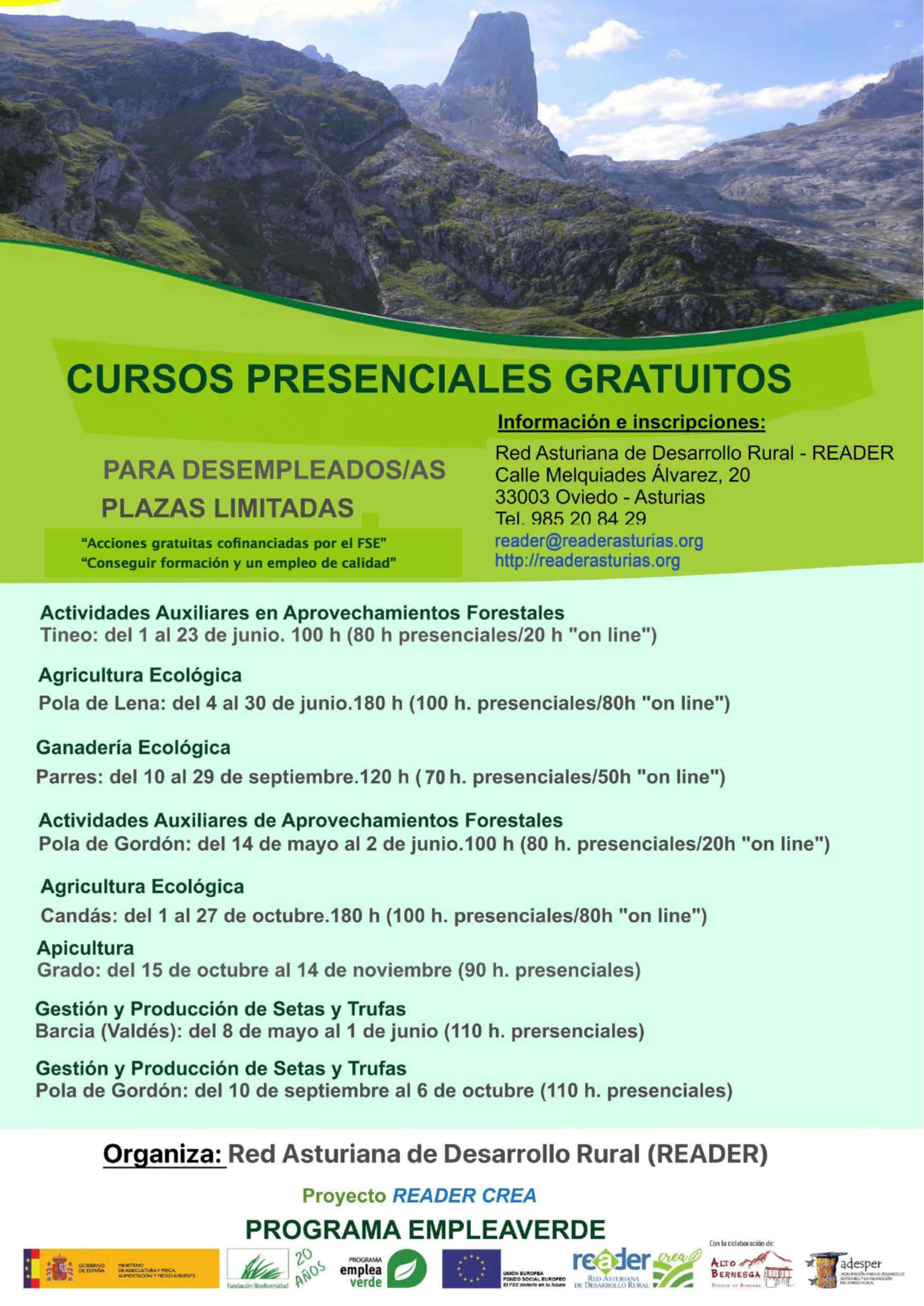 READER Crea cuenta con un total de ocho cursos gratuitos, tres de ellos presenciales y otros cinco mixtos, con un abanico que oscila entre las 100 y las 180 horas lectivas, que aportarán certificado de profesionalidad en cada materia a aquellos alumnos que superen el curso al que se hayan inscrito. Las plazas de cada uno de los cursos serán limitadas. El proyecto contempla también la contratación por parte de empresas o generación de un total de 10 empleos. Los cursos van desde la Agricultura ecológica, pasando por el aprovechamiento forestal, hasta la apicultura, etcétera.