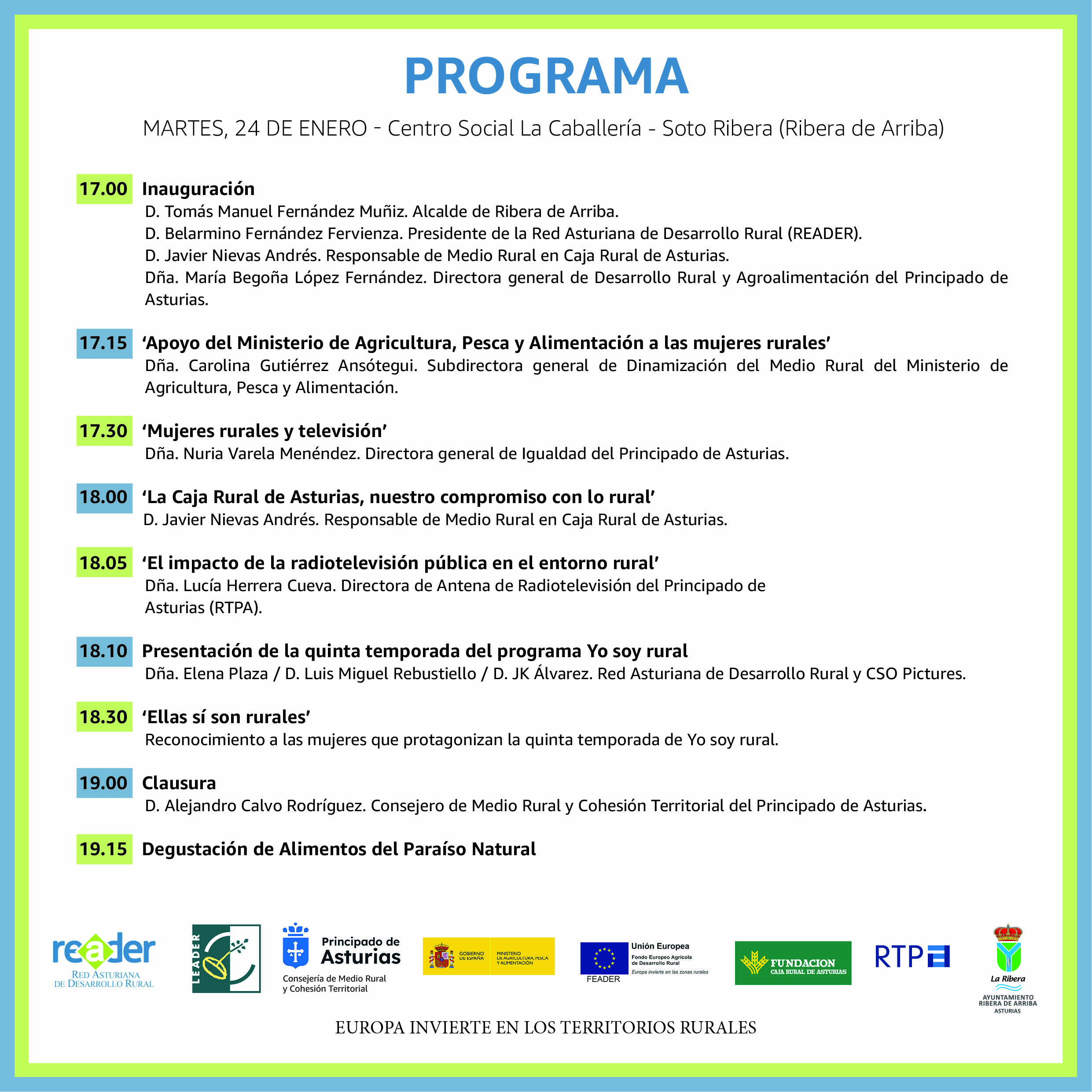 El próximo martes 24 de enero la Red Asturiana de Desarrollo Rural (READER) presenta la quinta temporada del programa de televisión Yo soy rural en el Centro Social La Caballería, en Soto de Ribera (Ribera de Arriba). El primero de los once programas se emitirá el miércoles 25 en la Televisión del Principado de Asturias (TPA), a las 22.30 horas.