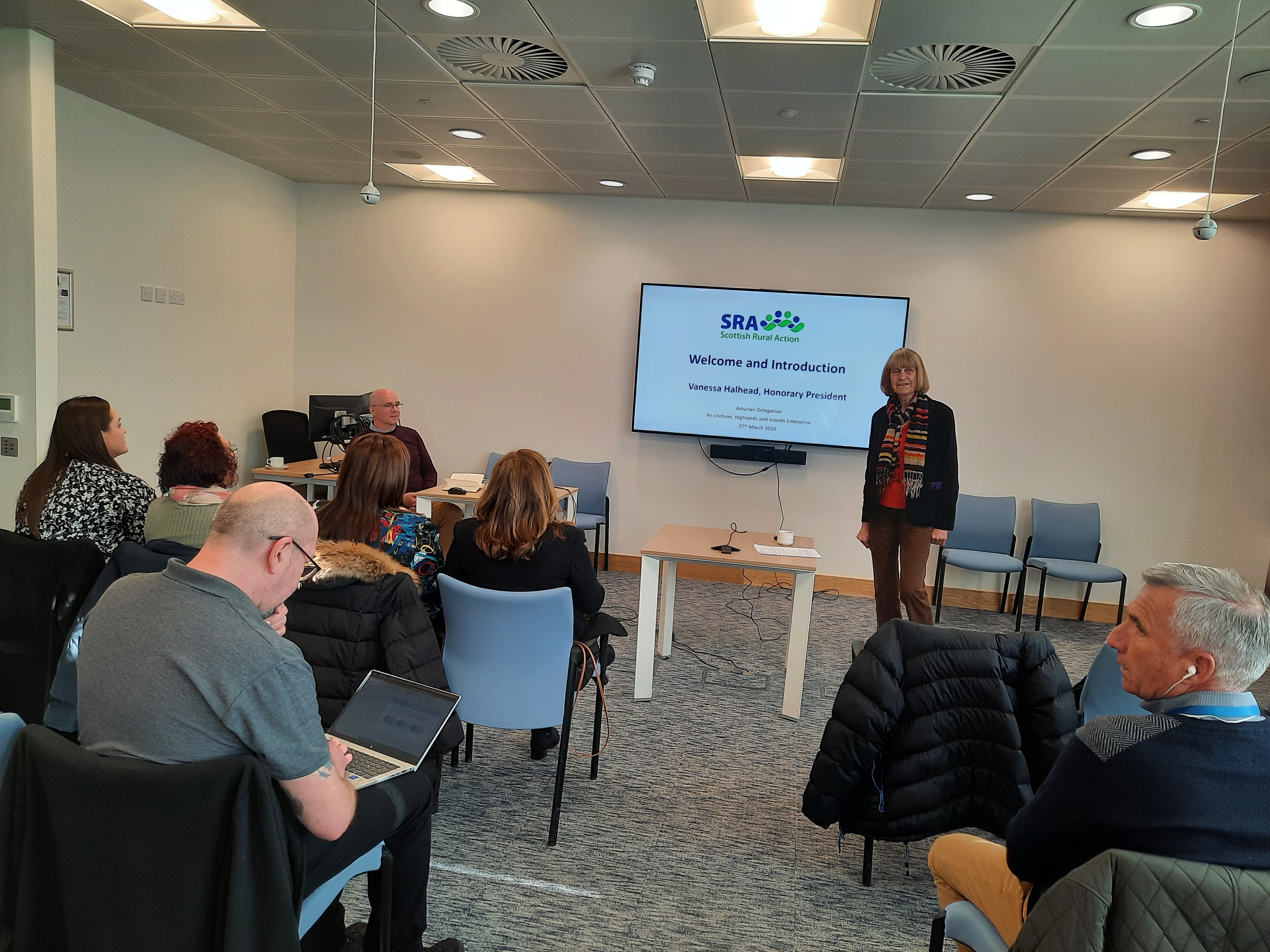 Comenzó esta jornada con la bienvenida por parte de Vanessa Halhead, presidenta honorífica de la Scottish Rural Action (SRA) y miembro del Parlamento Rural Escocés, donde defendió el medio rural escocés desde una perspectiva amplia sin exclusiones, tendiendo puentes entre la sociedad y la clase política, para dar voz a las zonas rurales de Escocia.