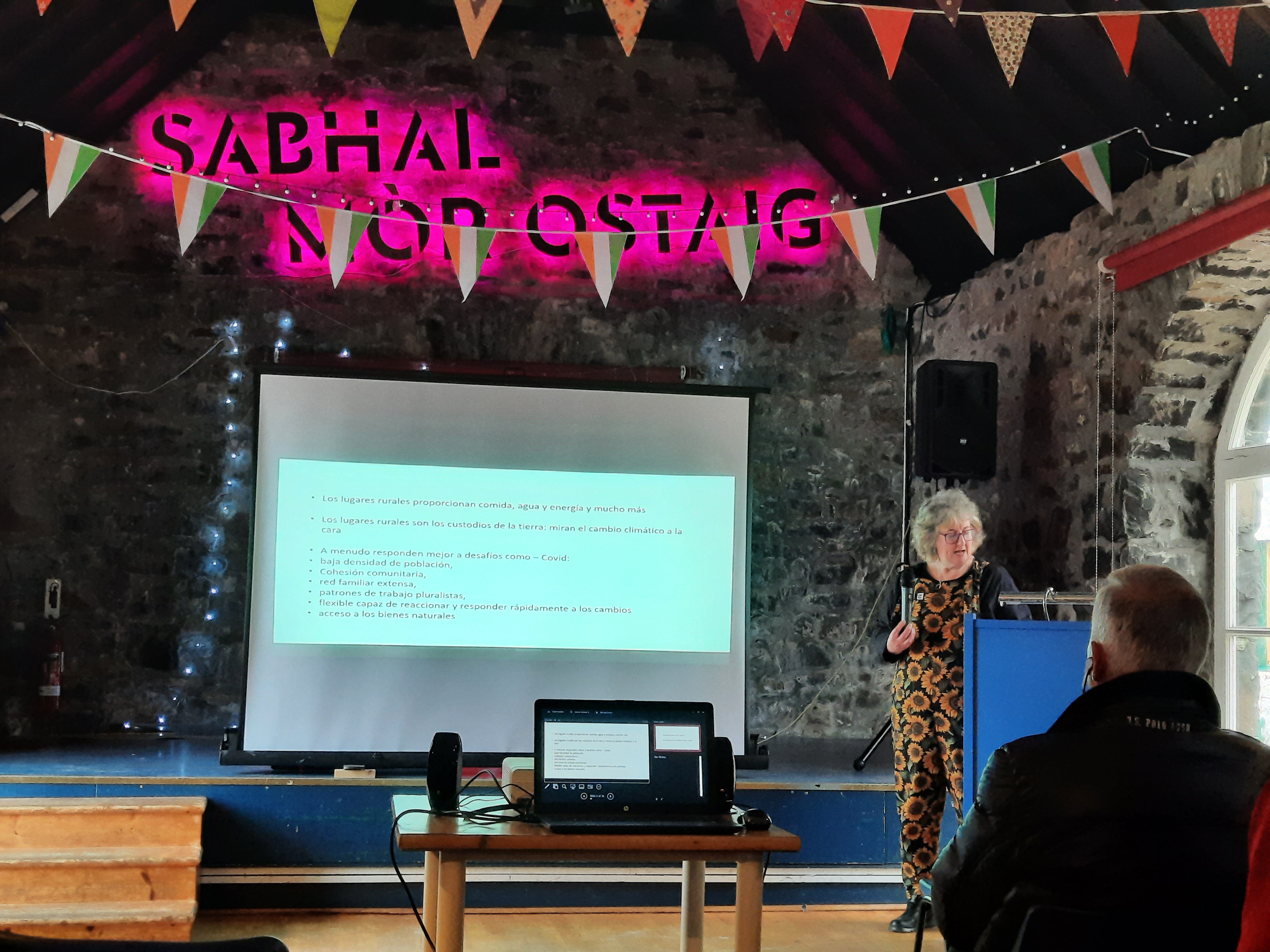 Theona Morrison es presidenta de la Scottish Rural Action y fundadora de CoDEL habló de los cambios necesarios para el turismo y su choque frontal con las políticas de vivienda. Relacionado con el Gaélico y las lenguas, señaló que “el valor social de la lengua debe ser entendido como algo fundamental”. Para la presidenta de SRA el SOM es ejemplo de “cómo regenerar a través de la educación, del idioma y la cultura. Ésta también es una manera de repoblar y debemos celebrar los que vuelven y se quedan, por pocos que sean”.