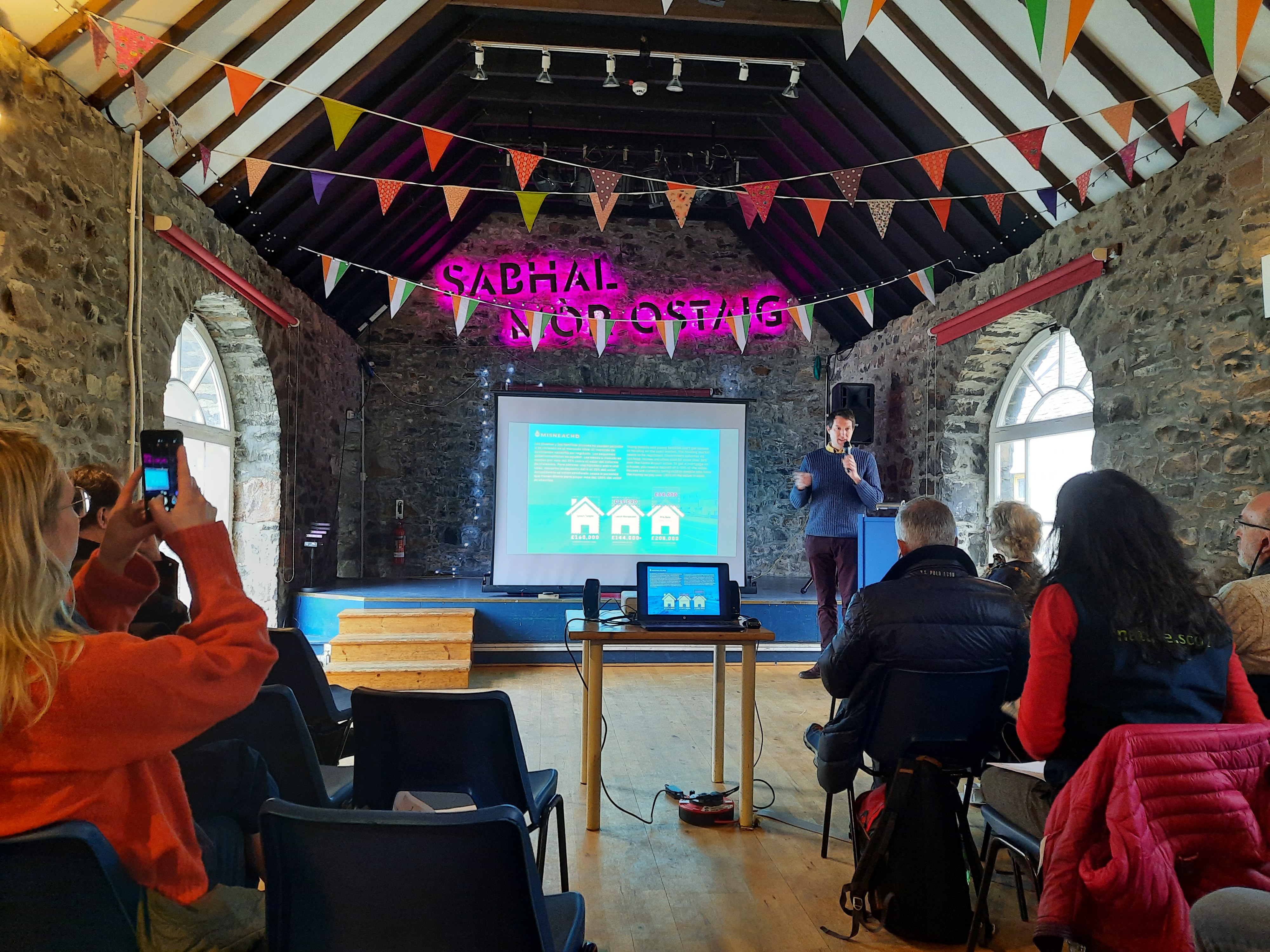 Señaló que la emigración dejó terrenos que fueron ocupados por personas con más poder económico llegadas de otros lugares y la dificultad para encontrar vivienda a las personas jóvenes de Skye u otras que quieren asentarse en la zona. De ahí que el propio centro educativo es promotor de una comunidad de viviendas, un housing, asequible y comunitario, también contemplado como un proyecto educacional.