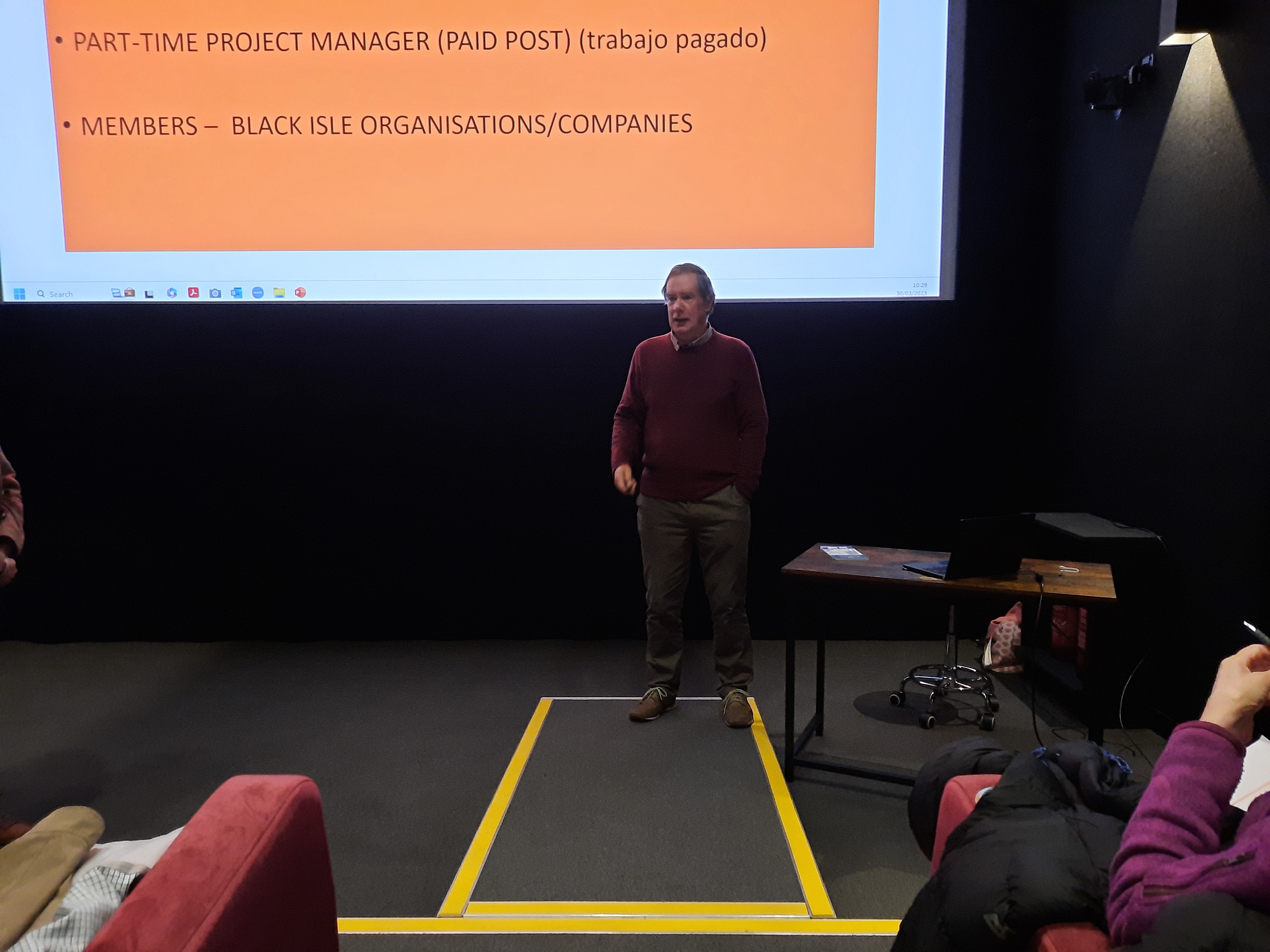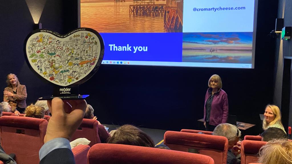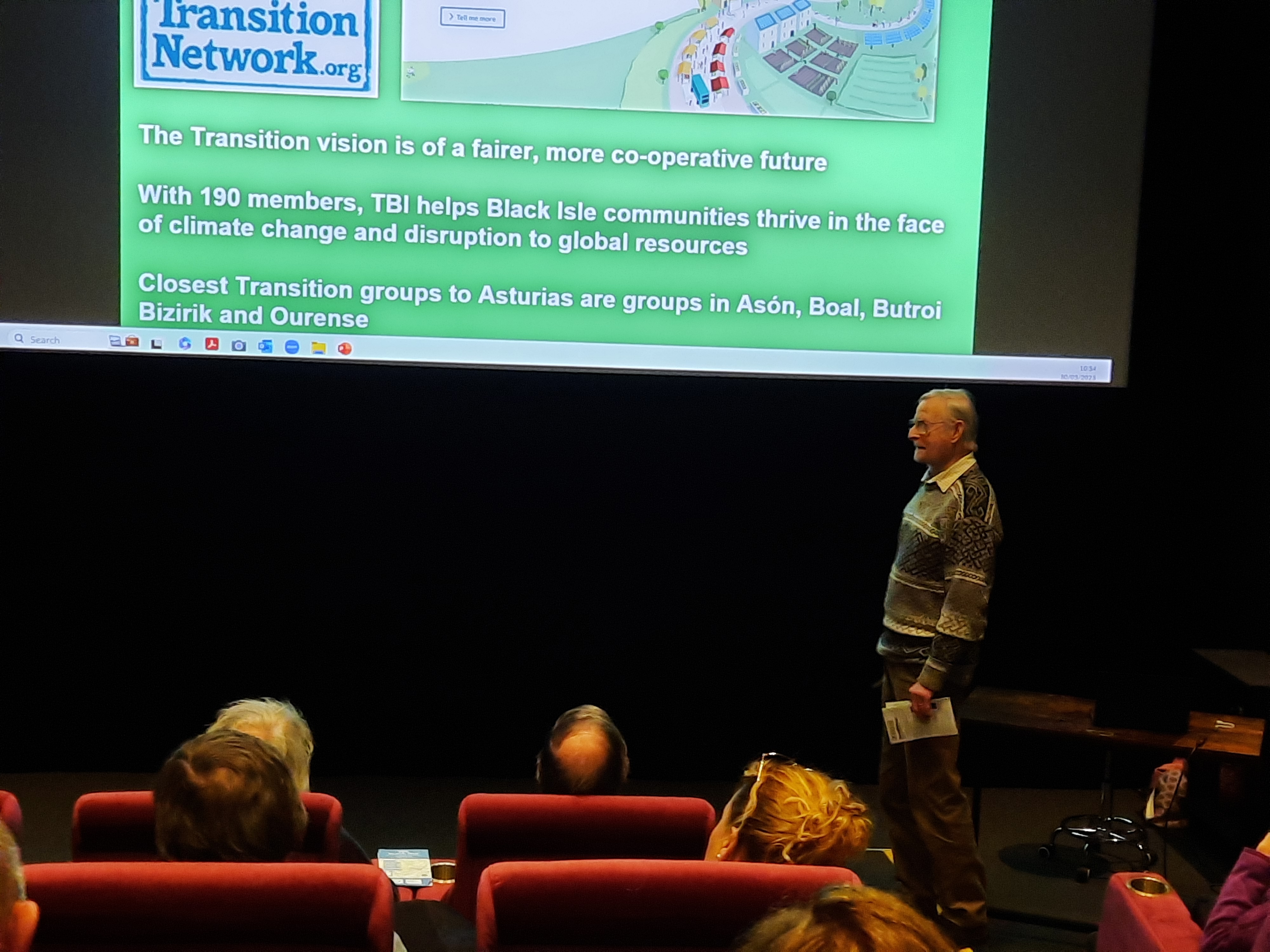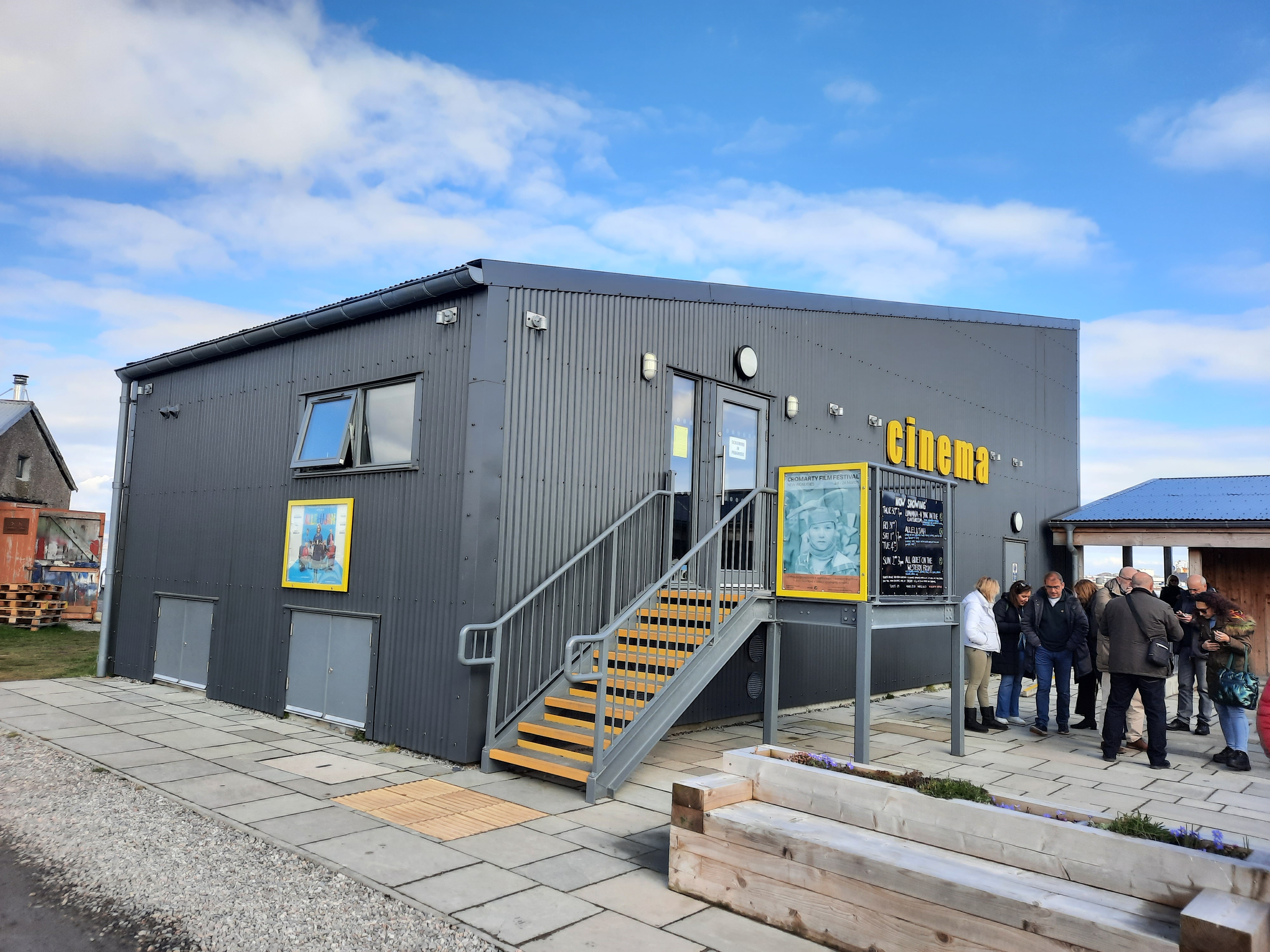 Comenzó la jornada con la visita al cine comunitario de Cromarty, donde la voluntaria Nicola Gear explicó que el proyecto va más allá de ser un solo un cine, sino que tiene una dimensión sociocultural como valor principal, financiada en su día por los fondos LEADER en un 60%, más la colaboración económica vecinal. Construido en seis meses, se inauguró justo antes de la pandemia en enero de 2020, pero no por eso dejó de funcionar, alquilado por familias. Cuenta con una sala con 35 plazas y el diseño de un arquitecto del pueblo.
