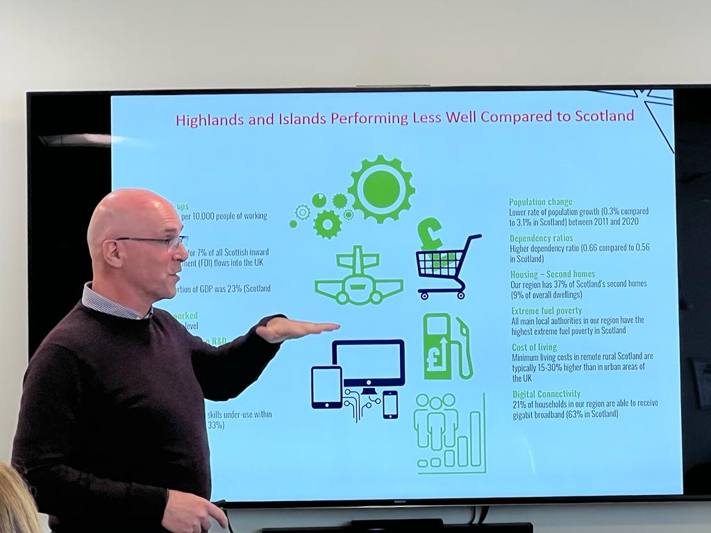 Robin Clarke del HIE habló del contexto socioeconómico reconociendo los defectos y virtudes que actualmente tienen, coincidentes en gran medida con los nuestros. Destacó como positivo el alto nivel de emprendimiento, un mayor porcentaje de innovación en el emprendimiento y las energías renovables como gran recurso. Entre lo negativo, un menor nivel de exportaciones, un crecimiento demográfico lento, lo que da lugar al envejecimiento de la población, la falta de vivienda y la pobreza energética, una conectividad que se está mejorando, pero la dificultad a la hora de conectar zonas remotas. El papel de la institución que representa es variable, dependiendo de las necesidades de los y las promotoras de la región, que tiene la densidad de población más baja de Europa después de Escandinavia, con un 8,5%.