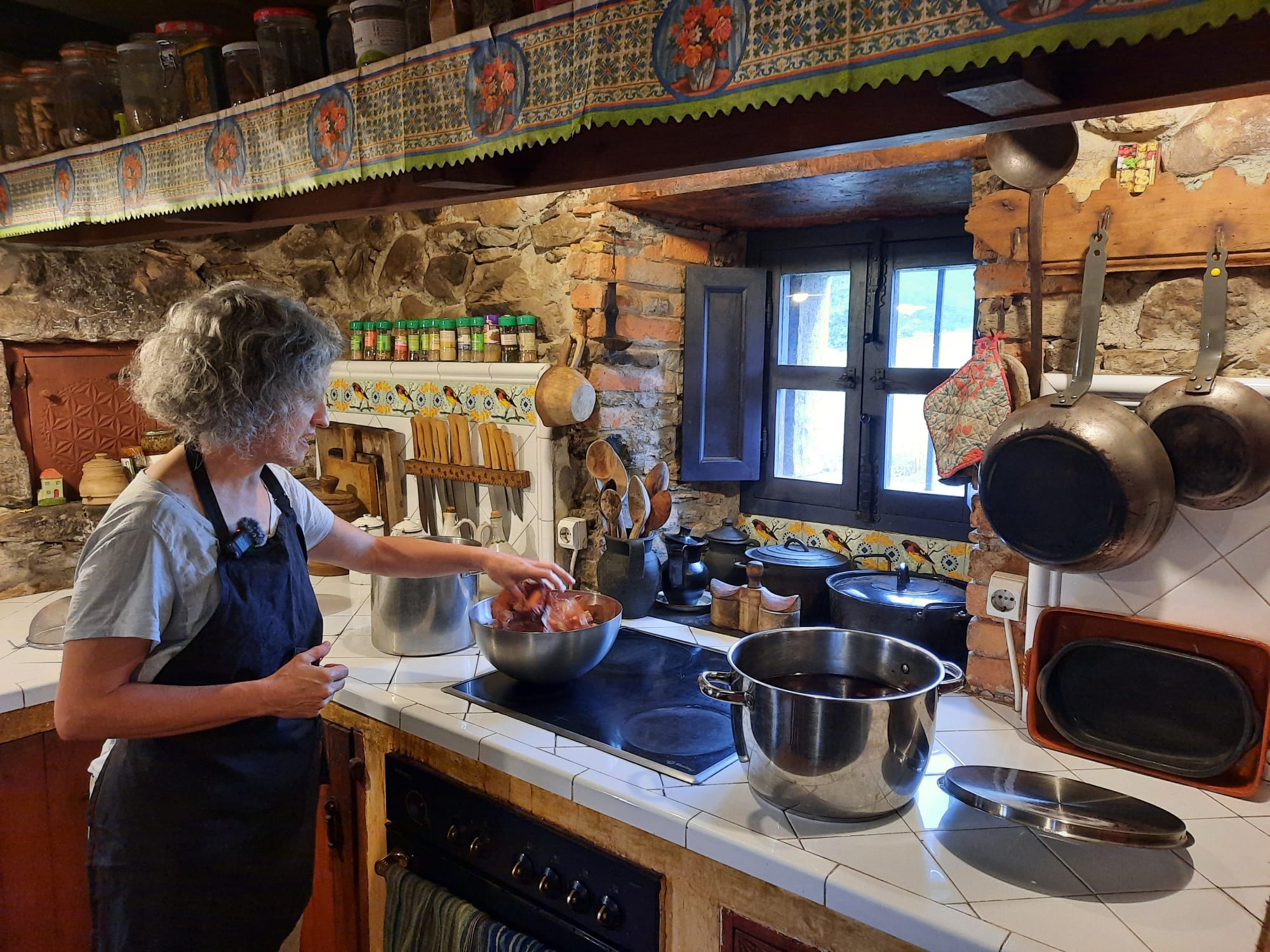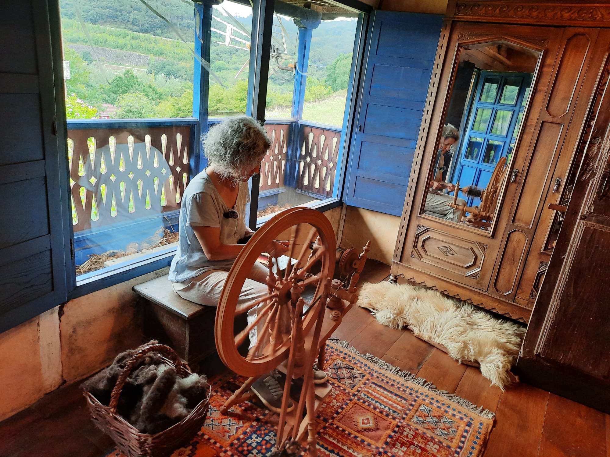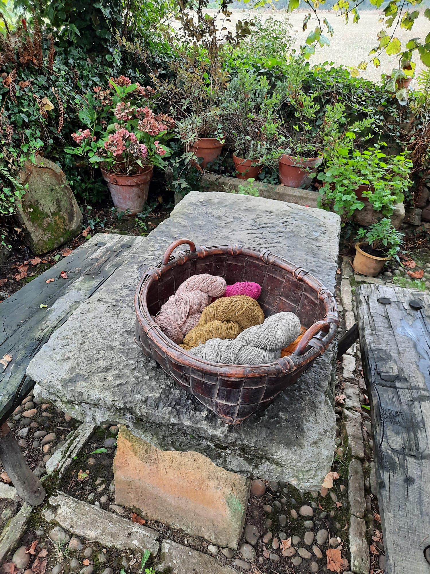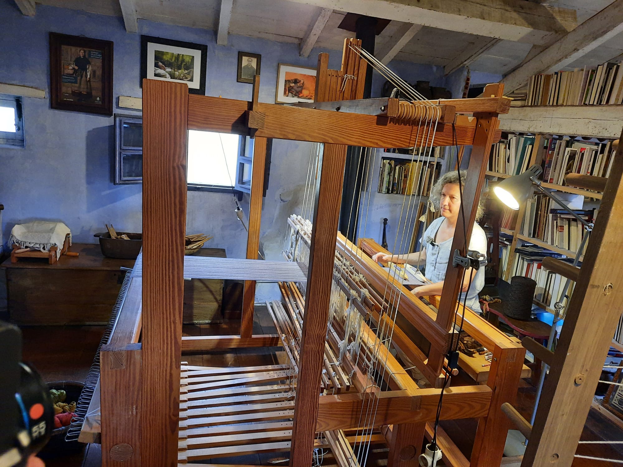 Cáscaras de cebolla, hojas y muérganos de nogal o abedul son algunas de las materias tintorias que emplea, y a las que califica como “los colores del territorio”, en un proceso que comienza con el tosquilado de las ovejas, el cardado y filado, el teñido con tintes naturales saludables y respetuosos con el cuerpo humano, y que termina con el tejido en el telar, al que compara con los ordenadores al ser pura matemática, con el empleo del sistema binario.